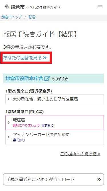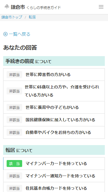 また回答結果の一覧を役所に持っていき、窓口の職員の方にお見せするなどして、手続きに関する相談の際に活用することも考えられます。